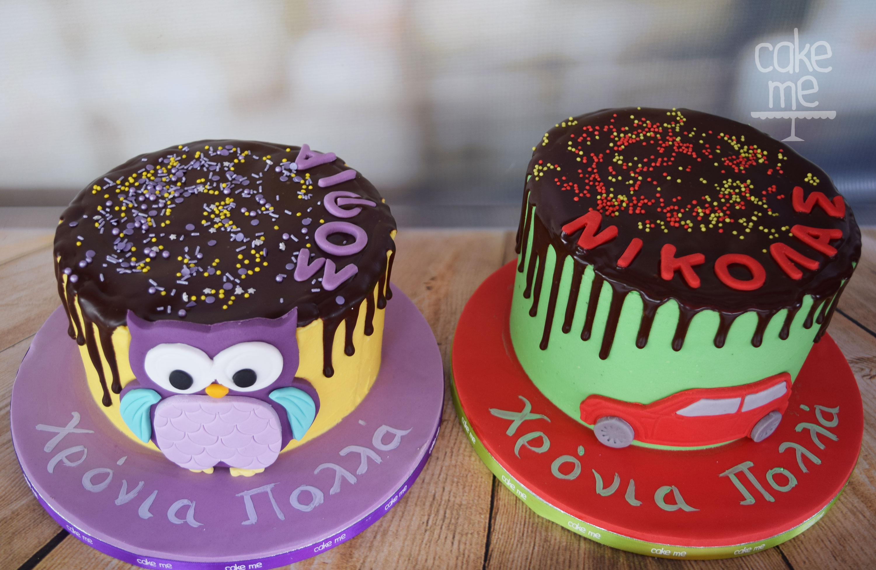 Μία «εύκολη» και οινομική εναλλακτική τούρτας είναι μία πολύχρωμη, με σχέδιο από κουπάτ μπισκότου απλικέ. Στην φωτογραφία βλέπουμε δύο εναλλακτικές με κουκουβάγια και αυτοκίνητο.
