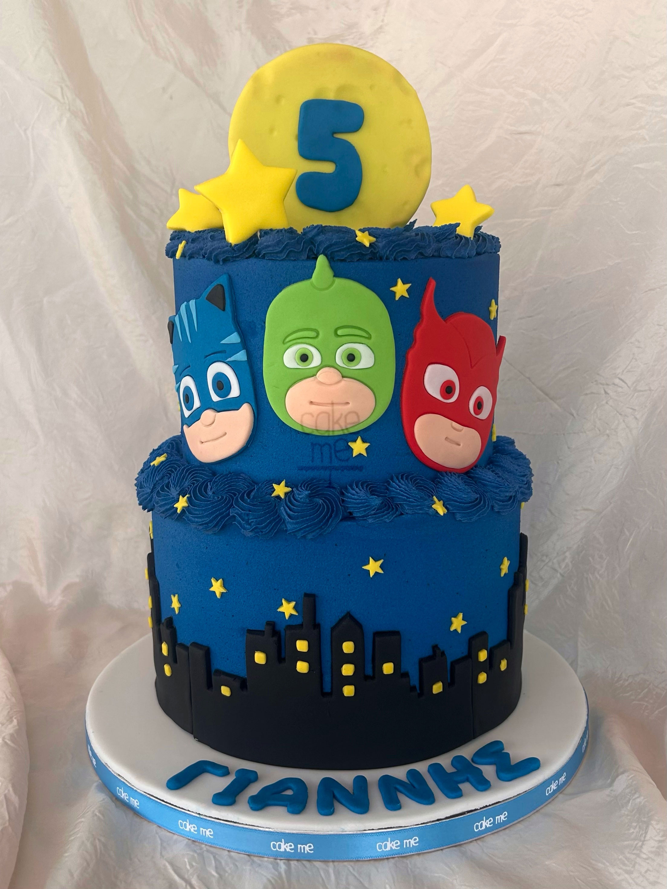 Μια διώροφη τούρτα με θέμα τους πιτζαμοήρωες, με τους 3 χαρακτήρες μπροστά στην τούρτα και μια εικόνα της πόλης την νύχτα από κάτω. Γύρω από την τούρτα υπάρχουν αστέρια και από πάνω το φεγγάρι με το νούμερο 5 μέσα.