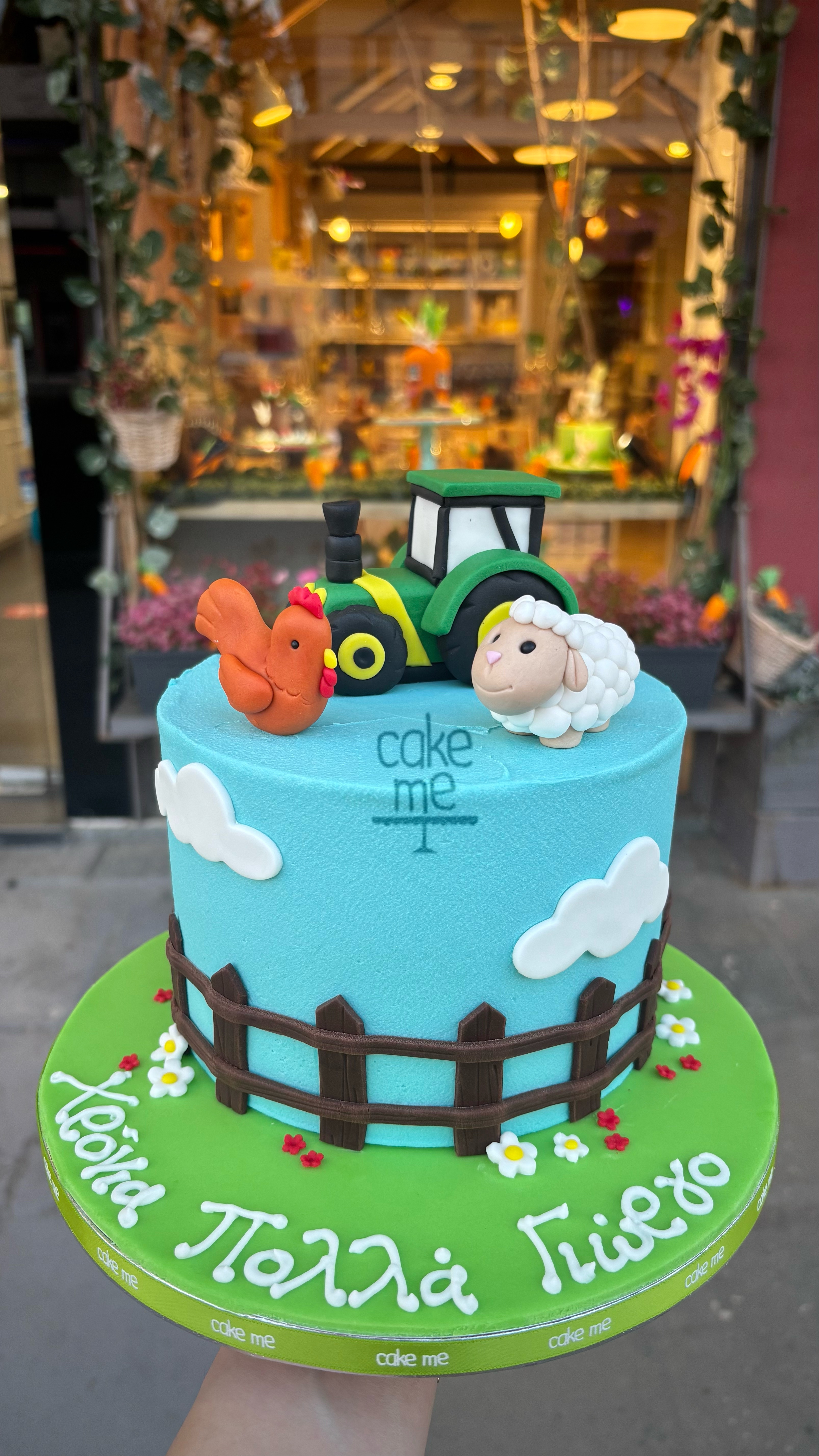 Μια κότα και ένα πρόβατο που κάθονται πάνω σε μια τούρτα στα χρώματα του ουρανού με θέμα την φάρμα, και πίσω ένα τρισδιάστατο πράσινο τρακτέρ.
