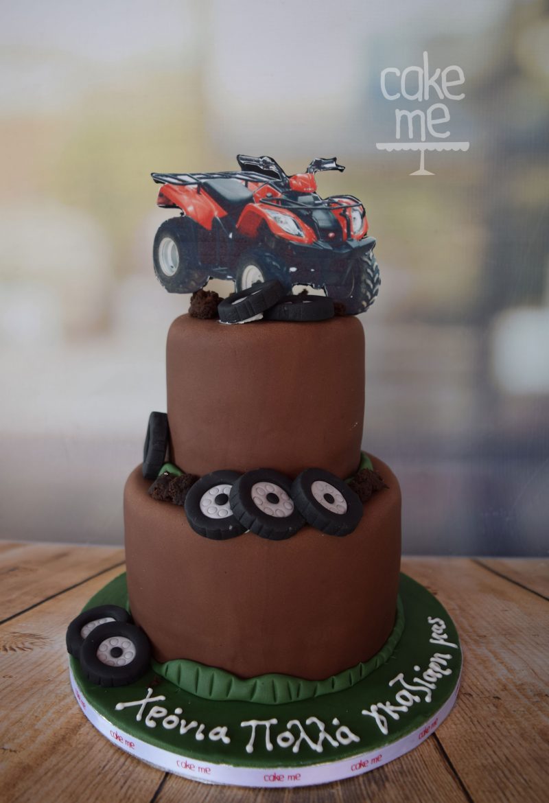 Διώροφη τούρτα με εκτύπωση γουρούνας και ρόδες από ζαχαρόπαστα