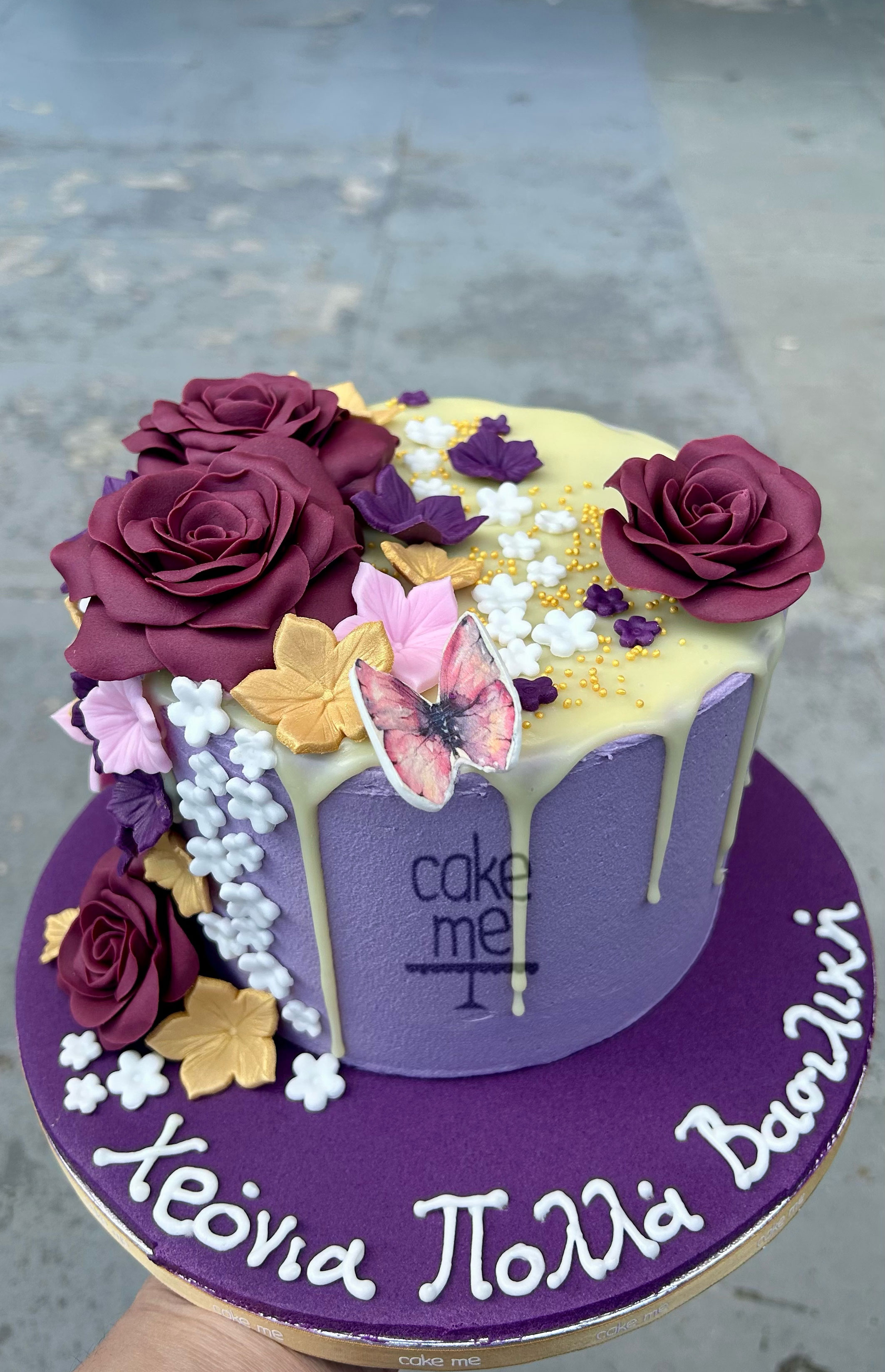 Εντυπωσιακή τούρτα με μεγάλα μωβ τριαντάφυλλα, drip λευκής σοκολάτας, λουλούδια και πεταλούδες.