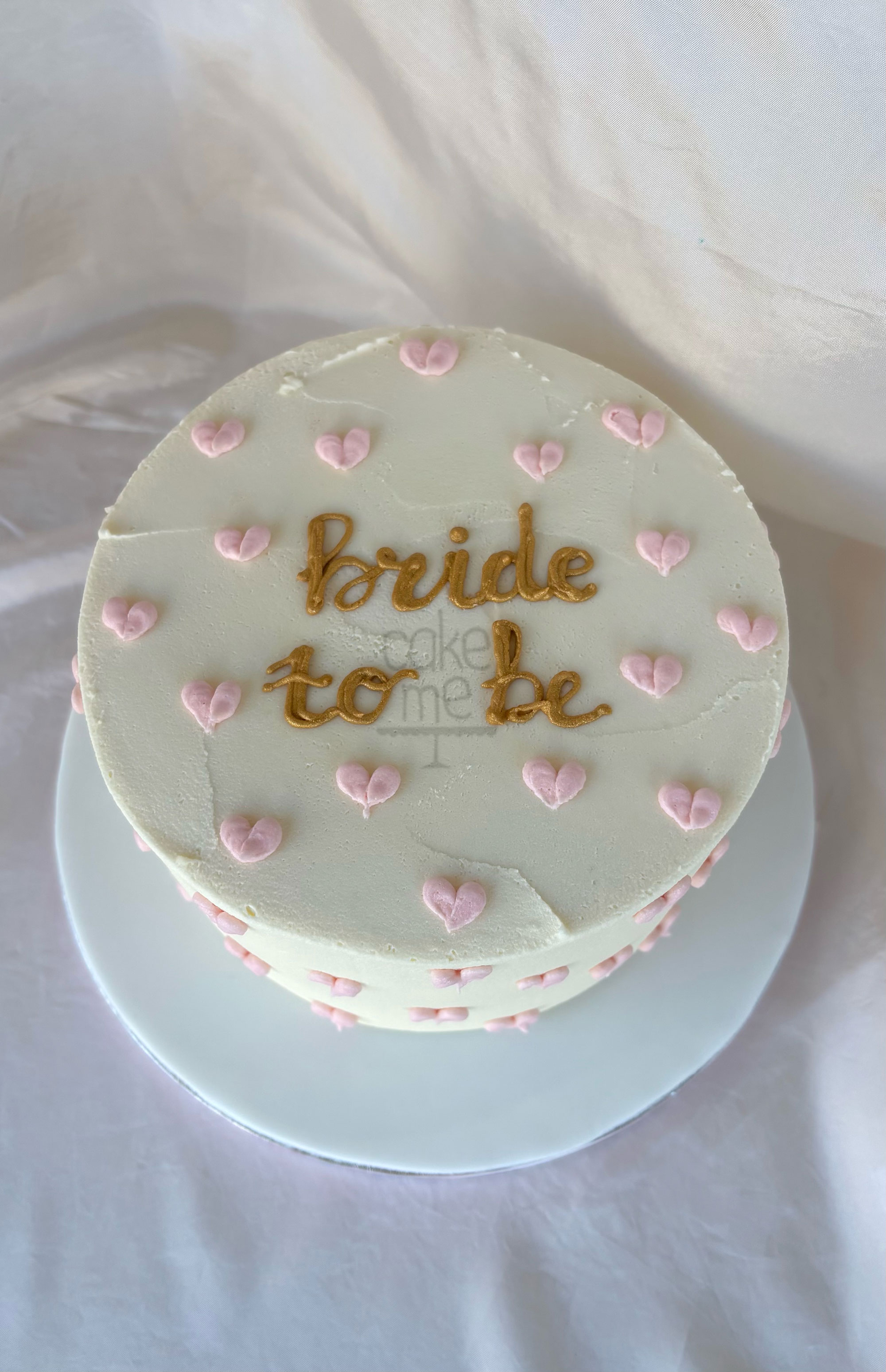 Μια τούρτα ιδανική για bachelorette πάρτυ και νέες νύφες, λευκή με ροζ καρδιές και την φράση «bride to be» με χρυσά γράμματα.