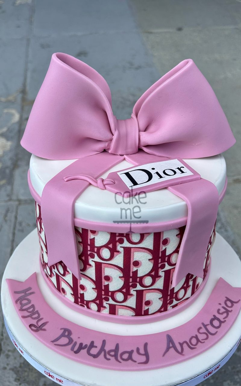 Μια τούρτα που μοιάζει με κουτί DIOR με το λογότυπο της εταιρίας και έναν μεγάλο ροζ φιόγκο.
