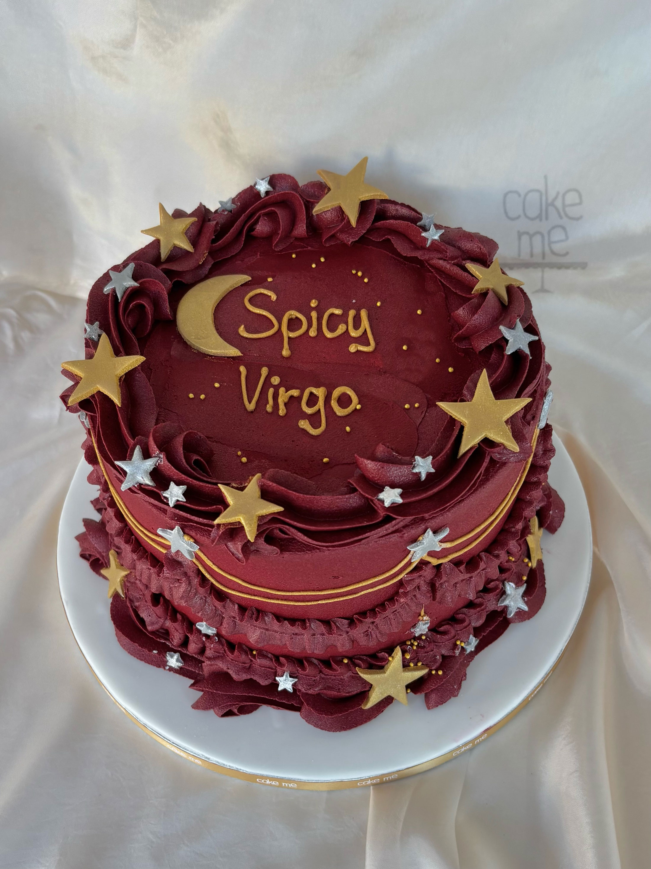 Μια vintage style μπορντό τούρτα με σχέδια βουτυρόκρεμας και επιγραφή «Spicy Virgo». Πάνω είναι στολισμένη με χρυσό μισοφέγγαρο και χρυσά-ασημένια αστέρια.