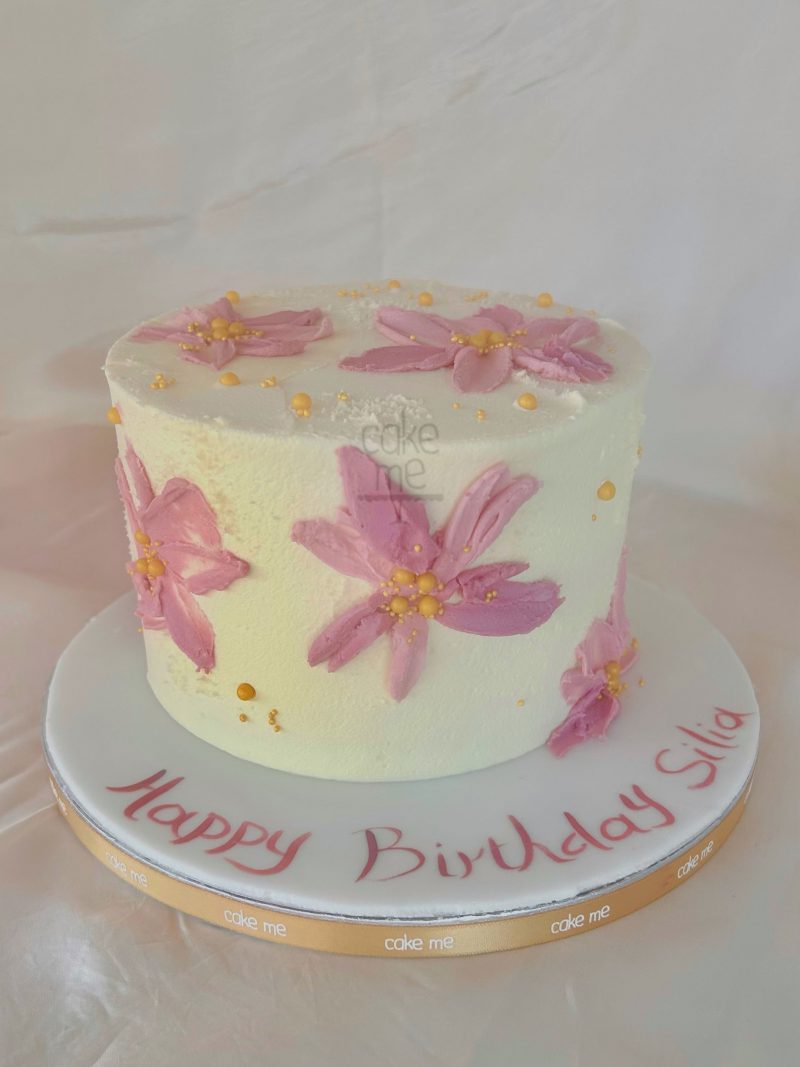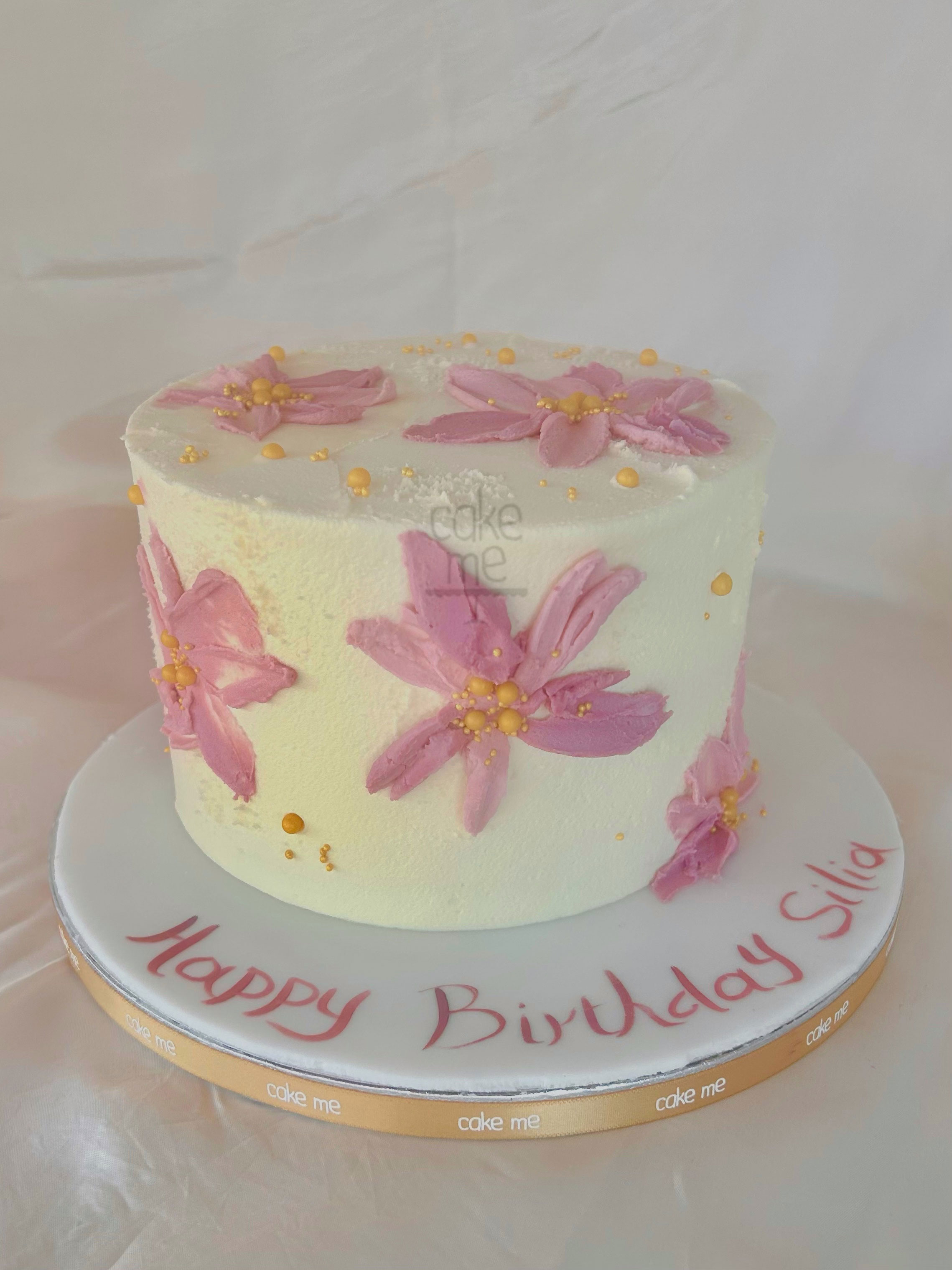 Μια minimal λευκή τούρτα με μεγάλα ροζ λουλούδια από βουτυρόκρεμα και χρυσές πέρλες.