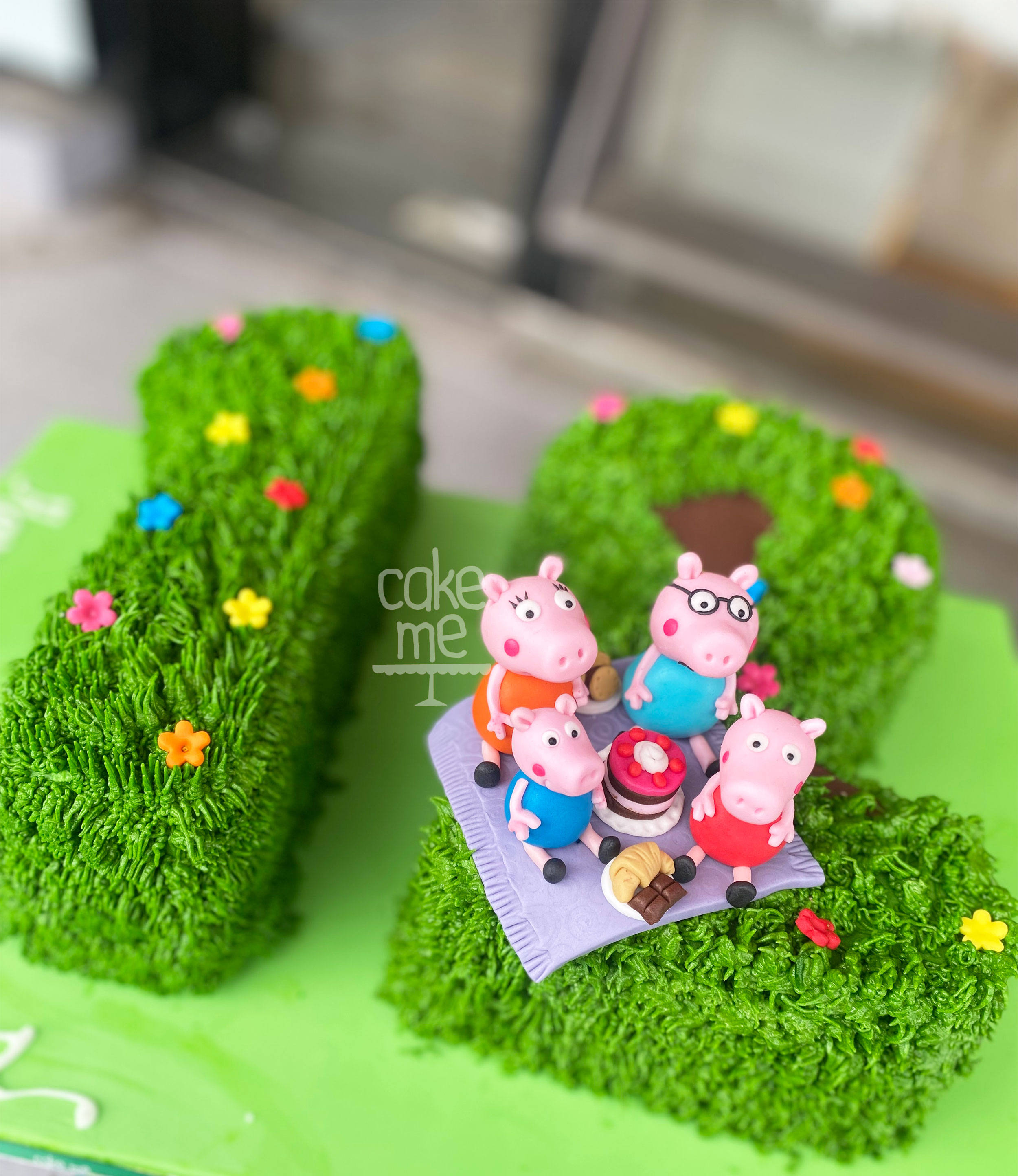 Τούρτα σε σχήμα αριθμού, με γκαζόν από βουτυρόκρεμα και την οικογένεια της Πέππα