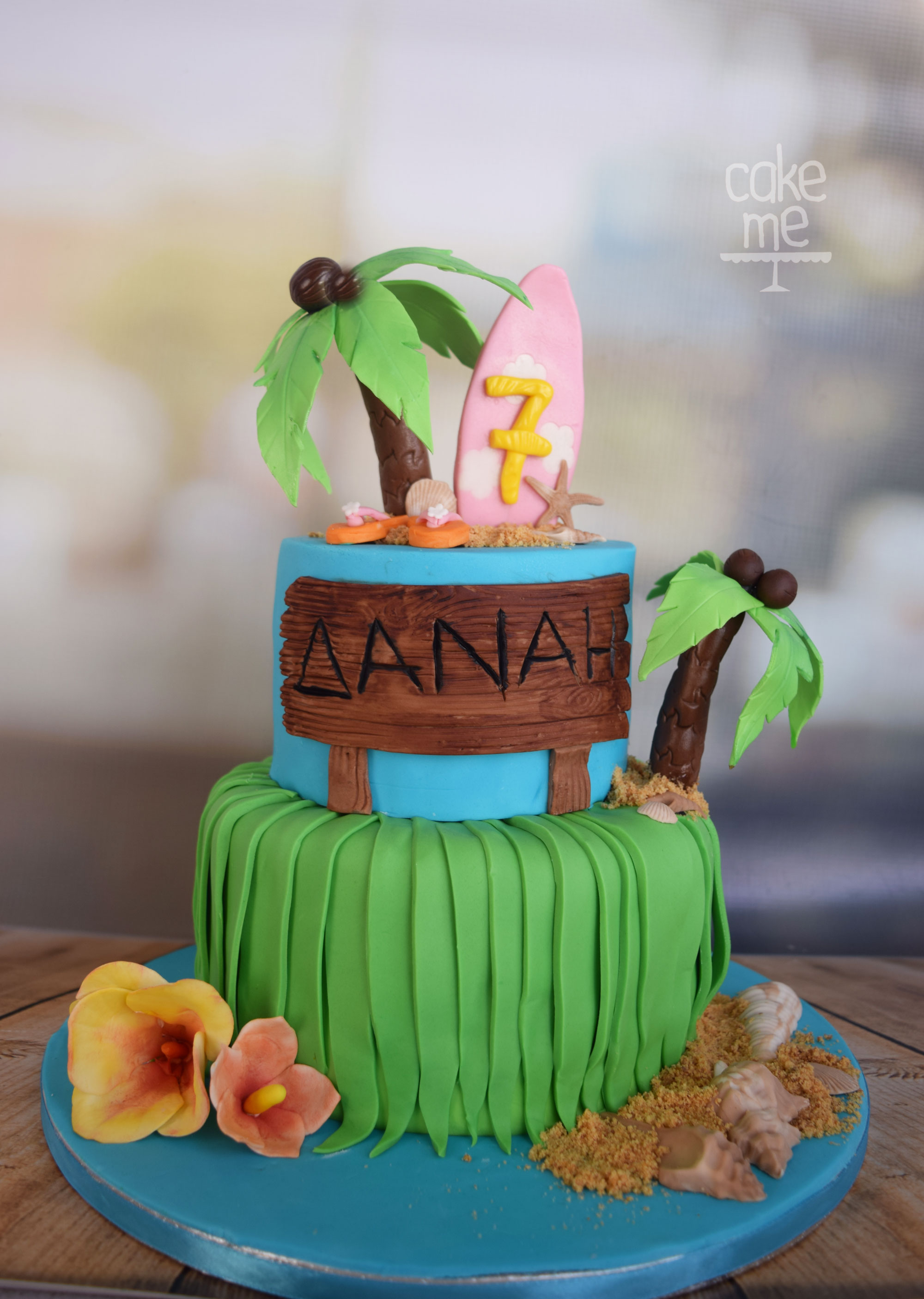 Τούρτα σε δύο ορόφους με ζαχαροπαστένια διακόσμηση για το hawaiian party της Δανάης που γίνεται επτά!