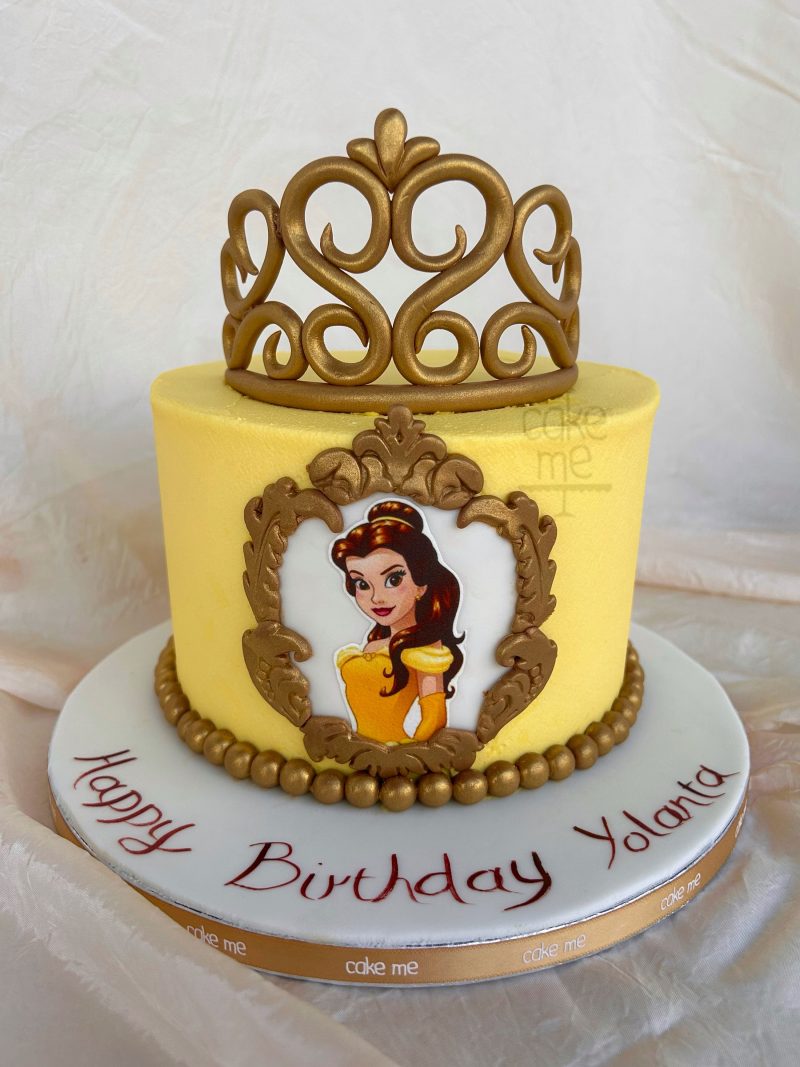 Μια εντυπωσιακή τούρτα εμπνευσμένη από την Πεντάμορφη και το Τέρας. Πάνω στην τούρτα είναι ένα τρισδιάστατο χρυσό στέμμα/ κορόνα από ζαχαρόπαστα και μπροστά είναι η πριγκίπισσα Μπελ σε μια χρυσή κορνίζα. Η τούρτα περιτριγυρίζεται επίσης από χρυσές πέρλες.