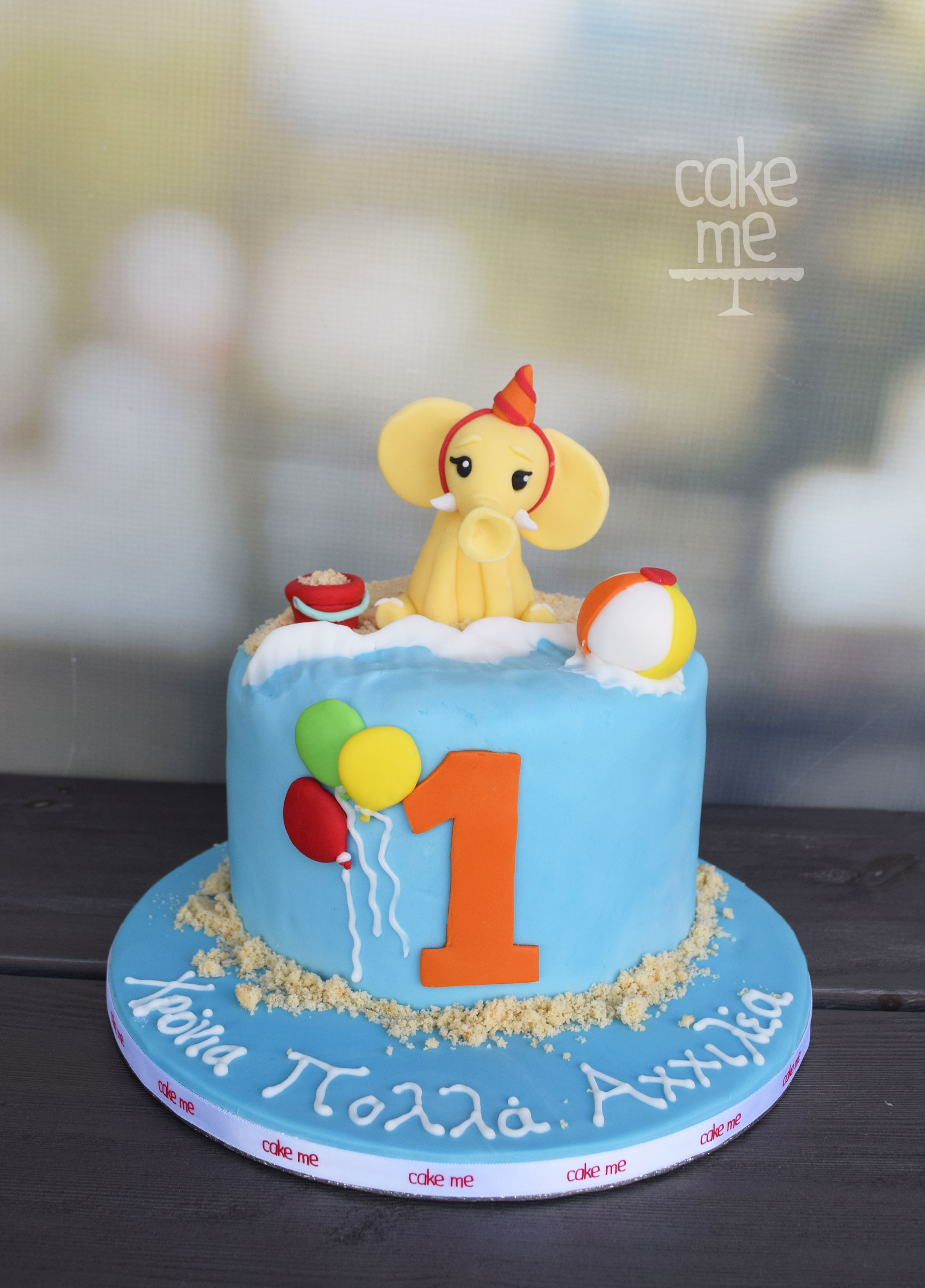 Μία τούρτα με ένα γλυκό κίτρινο ελεφαντάκι για τα πρώτα γενέθλια του Αχιλλέα σε μιά όμορφη καλοκαιρινή παραλία με πολλά μπαλόνια