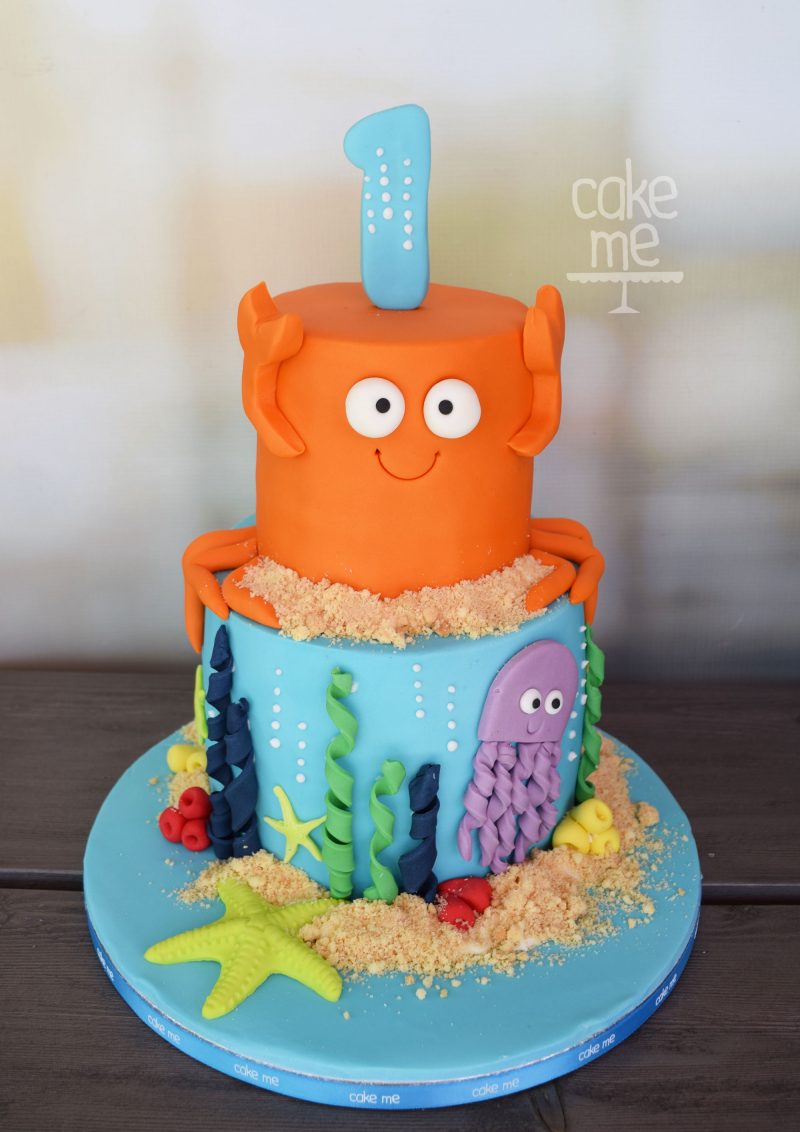 Θαλασσινή τούρτα, με όροφο-καβούρι, και στοιχεία από βυθό: κοχύλια, αστερίες, κοράλια και καλαμαράκια