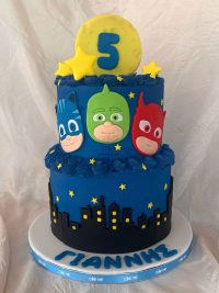 Μια διώροφη τούρτα με θέμα τους πιτζαμοήρωες, με τους 3 χαρακτήρες μπροστά στην τούρτα και μια εικόνα της πόλης την νύχτα από κάτω. Γύρω από την τούρτα υπάρχουν αστέρια και από πάνω το φεγγάρι με