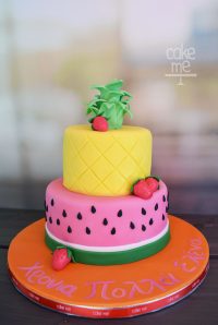 Καλοκαιρινή διώροφη τούρτα σε σχήμα καρπούζι και ανανά, με φράουλες από ζαχαρόπαστα