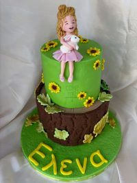 Ένα μικρό κορίτσι με το λαγουδάκι του που κάθετε πάνω σε μια διώροφη τούρτα με θέμα το φθινόπωρο. Ο ένας όροφος απεικονίζει ένα λιβάδι με ηλιοτρόπια ενώ ο δεύτερος ένα κούτσουρο με πεσμένα φύλλα.