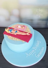 Κυρία με μαγιό στην παραλία. Κι ένα μωρό που κοιμάται δίπλα, στην ροζ πετσέτα του. Η τούρτα έγινε για την γιαγιά του μωρού.