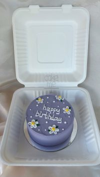 Μια χαριτωμένη bento stlyle μωβ τούρτα με λουλούδια (μαργαρίτες) από βουτυρόκρεμα και ευχή "Happy Birthday".