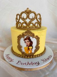 Μια εντυπωσιακή τούρτα εμπνευσμένη από την Πεντάμορφη και το Τέρας. Πάνω στην τούρτα είναι ένα τρισδιάστατο χρυσό στέμμα/ κορόνα από ζαχαρόπαστα και μπροστά είναι η πριγκίπισσα Μπελ σε μια χρυσή κορνίζα. Η τούρτα περιτριγυρίζεται επίσης